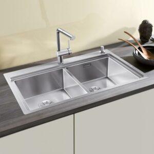 Évier de cuisine, évier d’angle, à encastrer, en Inox brossé, BLANCO LANTOS 9 E-IF, 1 cuve et 1/2, 1 égouttoir à gauche, compact, vidage automatique, bonde à panier Ø 90 mm automatique Inox et siphon Ø 40 mm à culot démontable avec une prise machine à laver. Evier Inox garanti à vie, qualité allemande, percements pour robinetterie et commande de vidage. Évier pour sous-meuble 90×90/60 cm, dimensions : hors-tout : 930 X 510 mm, de la cuve : 330 x 420 x 160 mm. Solution d’angle, également encastrable en ligne. Finition des bords IF pour un encastrement classique ou à fleur. Nombreux accessoires disponibles en option.